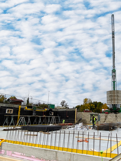 Die Baugrube ist fertiggestellt, derzeit erfolgen die Arbeiten an der Tiefgarageneinfahrt. Parallel dazu richtet der Hochbau die Baustelle ein. Im nächsten Schritt werden Drainage und Grundleitungen verlegt, bevor mit dem Gießen der Bodenplatten begonnen wird.